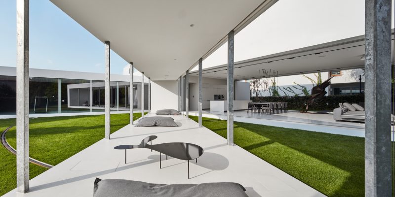 Tuy thiết kế mặt trước trông có vẻ hơi đơn điệu nhưng không gian mở rộng về khu vườn lại tạo ra sự thoáng đãng và rộng rãi rất ấn tượng.